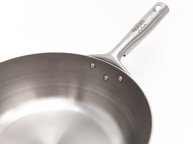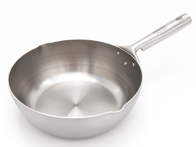 本体には内面からチタン、アルミニウム、ステンレスの異種金属を層状にサンドした3層鋼材(クラッド材)を使用しており、それぞれの金属が弱点を補いあっています。中間層に熱伝導性が高いアルミニウムを挟むことで、熱がフライパン全体へマイルドに広がり、焦げ付きにくく、使いやすいフライパンとなっています。熱源付近が局所的に熱くなる純チタン製にはない特徴です。また外面のステンレス素材によりIH調理機にも対応しています。