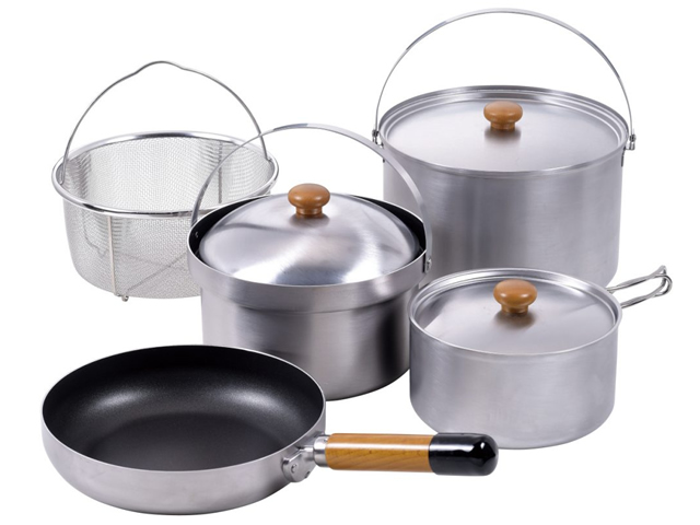 ライスクッカー 本体-4層クラッド材・フッ素加工 フタ-ステンレス鋼、フライパン 4層クラッド材・フッ素加工、ステンレス大鍋 ステンレス鋼、ステンレス片手鍋 ステンレス鋼、メッシュバスケット ステンレス鋼、ツマミ・ハンドル 天然木