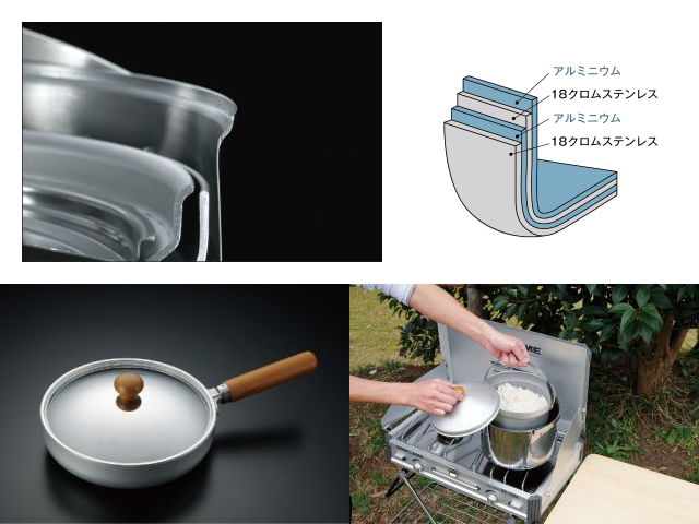 4層クラッド材とはアルミニウムとステンレスを貼り合わせることで単一材料では実現できない複合特性を持たせた金属材料。熱伝導率の高いアルミニウムが加熱時の熱を鍋全体に素早く伝え、蓄熱性の高いステンレスが煮込む際や保温時になどに熱を保ちます。
